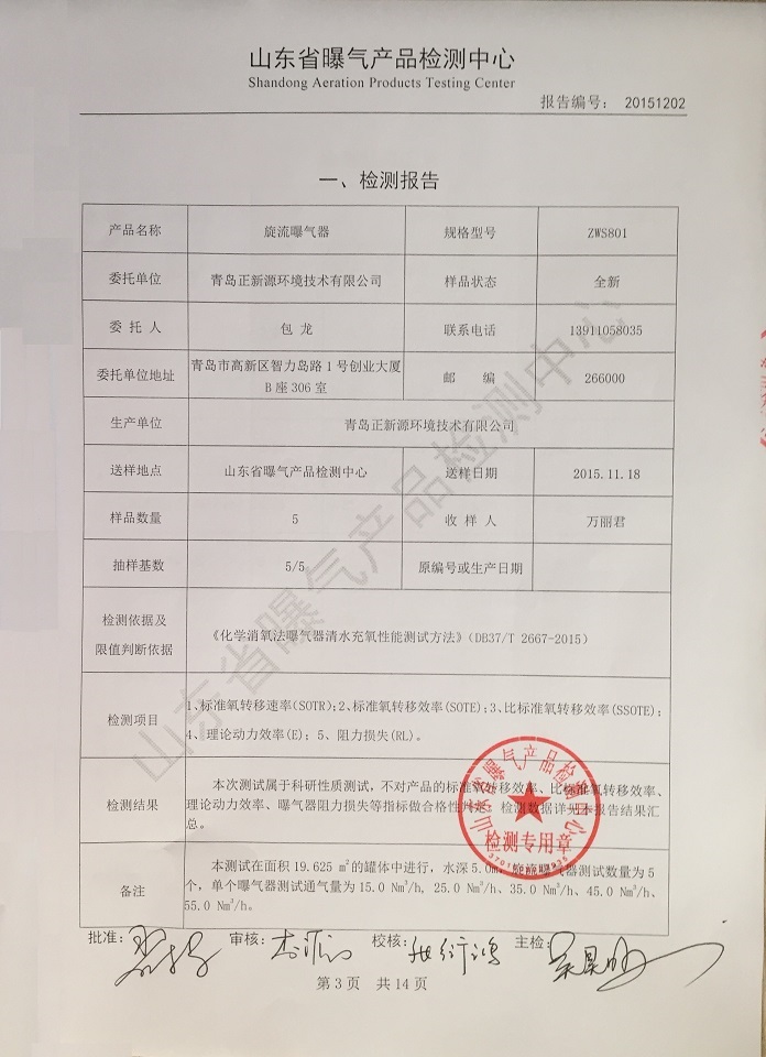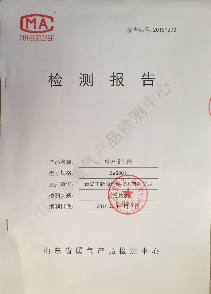 青島正新源環境技術有限公司的專利產品---旋流剪切曝氣器,順利通過國家認證CMA質量檢測機構的檢測。